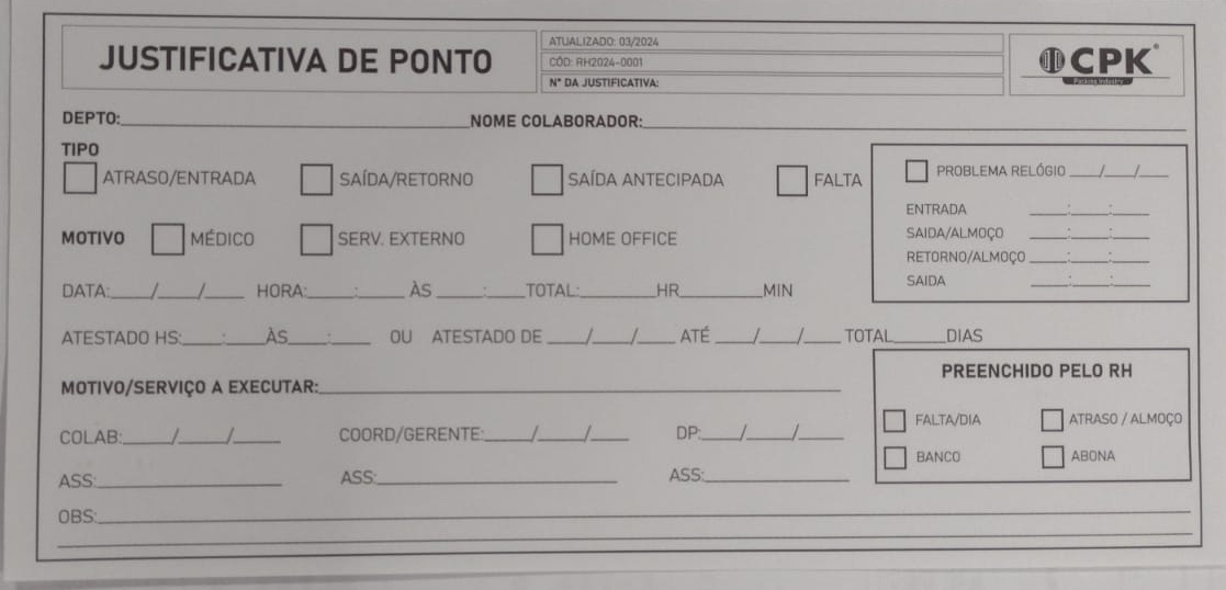A justificativa de ponto deve ser obrigatoriamente preenchida e assinada pelo colaborador e pelo líder imediato, sendo encaminhada ao setor de Recursos Humanos, conforme as regras abaixo: